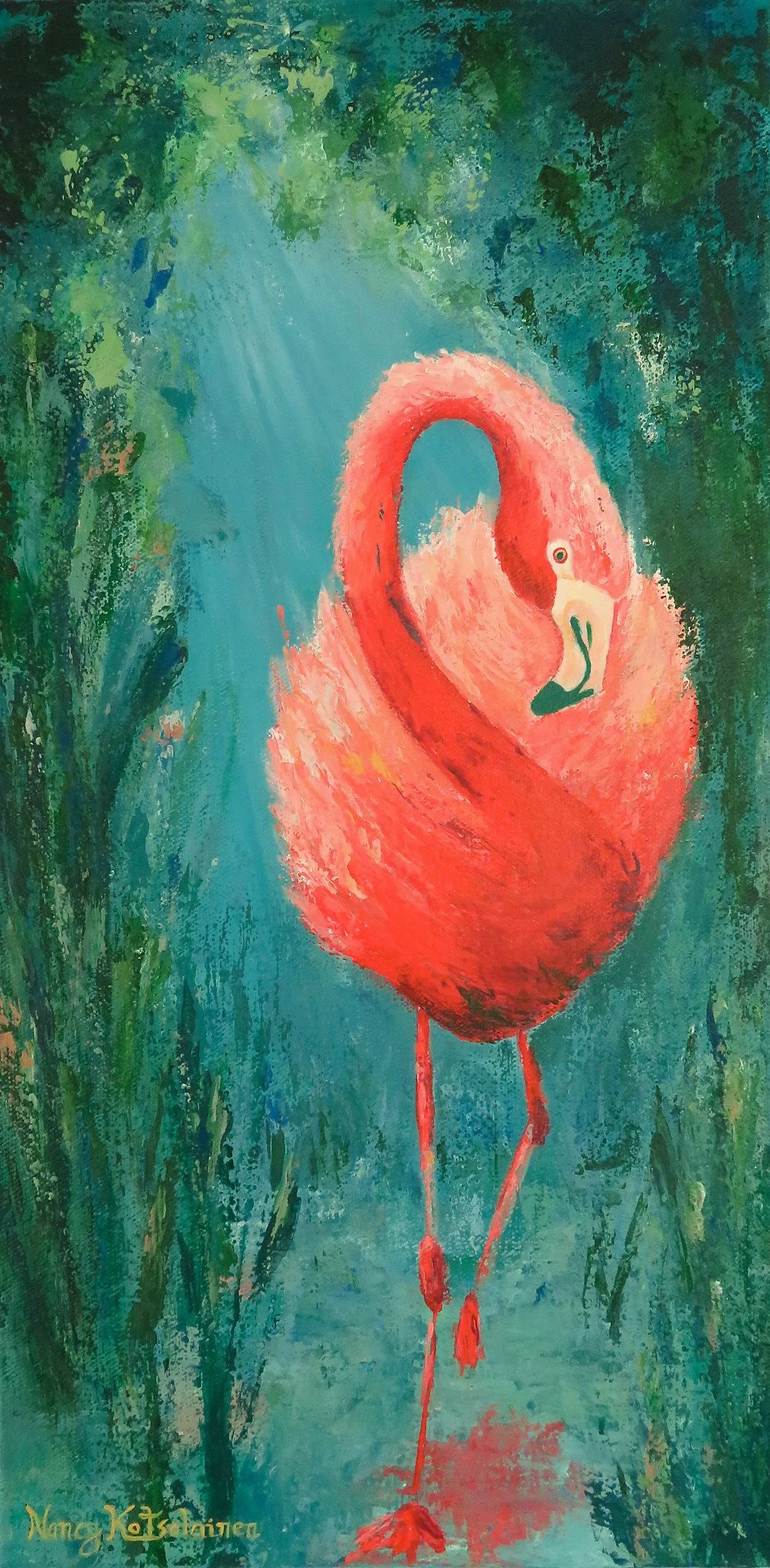 It’s been so much fun to play with these happy, bright colours. For most of the paintings, the background was done with brushwork and the wildlife done with palette knife. The exceptions were “Here’s Looking at You Kid” (our mischievous little frog) and Elysian Dusk (welcoming lighthouse at dusk).